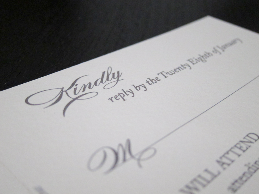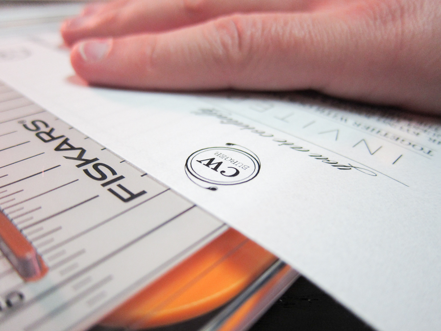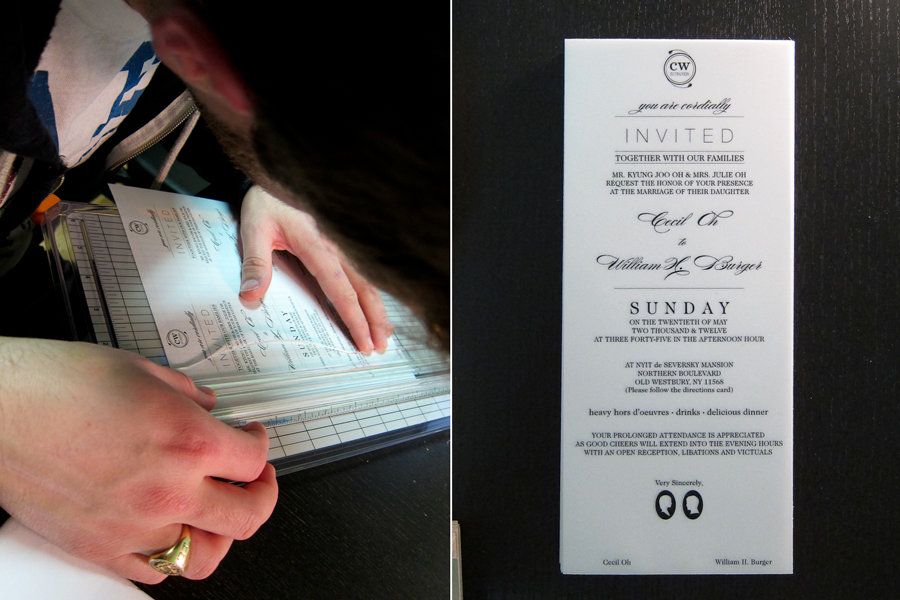 Paper: White Vellum #36, Recycled Taupe Brown Fiber (for both envelopes and directions card), and heavy stock Rose paper from Paper Presentation located in NYC.
